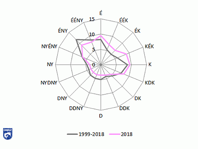 A 24. ábrán a szélirány gyakorisági eloszlását láthatjuk Budapest Pestszentlőrincen az 1999-2018 közötti időszak átlaga és a 2018. év adatai alapján. A sokévi átlag jól mutatja, hogy Budapest esetében az uralkodó szélirány az északnyugati. A keleti szélirány hangsúlyosabb megjelenésének oka a városi hősziget jelensége, valamint a Budai-hegység és a Pesti-síkság közötti helyi légkörzés egymást erősítő hatásában keresendő. A leggyakoribb szélirány 2018-ban az északi irány volt, alig maradt el tőle a második leggyakoribb, a keleti irány. A leggyakoribb szélirány mellett ehhez az irányszektorhoz tartozott a legnagyobb átlagsebesség, és a legerősebb széllökések. A 1999-2018-as átlagnál valamivel nagyobb arányban figyeltünk meg az északkeleti szektorba tartozó szélirányokat, míg a vártnál kisebb relatív gyakoriság jellemezte 2018-ban az északnyugat és délkelet közötti szélirányszektorokat.