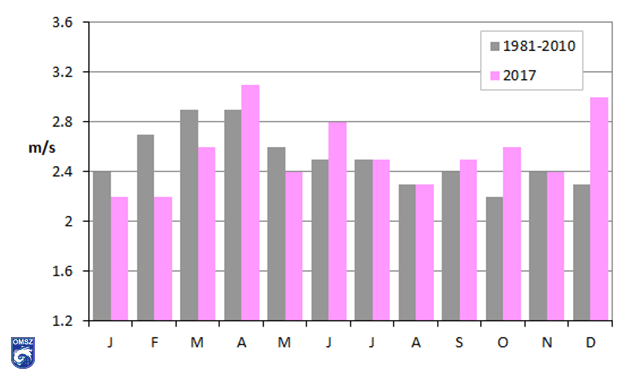Megfigyeléseink szerint 2017-ben a talaj közelében az állomásokon mért szélsebesség évi átlaga 1,3-6,7 m/s között változott, országos átlagban 2,5 m/s adódott. A havi átlagos szélsebesség éves menetében (18. ábra) általában márciusban és áprilisban jelentkezik a maximum, míg a legalacsonyabb értékeit októberben veszi fel. 2017-ben a havi átlagos szélsebesség Budapest-Pestszentlőrinc állomáson áprilisban volt a legnagyobb (3,1 m/s), melyet a decemberben (3 m/s), majd júniusban (2,8 m/s) mért érték követ. A legalacsonyabb havi átlagos szélsebesség januárban és februárban adódott a várt október helyett.