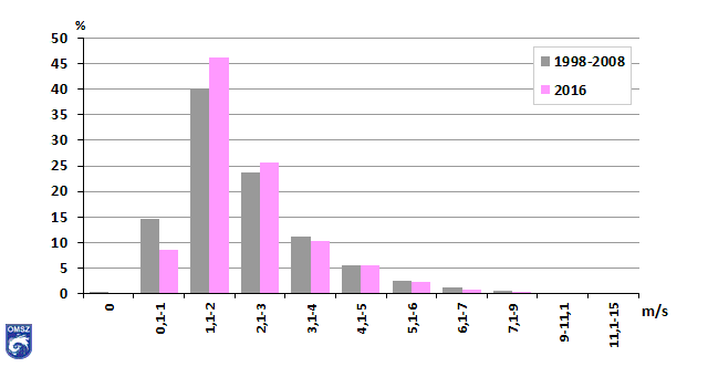 Az 1998-2008 közötti, óránkénti szélsebességi értékekből számolt relatív gyakoriságot mutatjuk be a 20. ábra oszlopdiagramján, Budapest-Pestszentlőrinc állomásra vonatkozóan. Látható, hogy az eloszlás aszimmetrikus, vagyis a kisebb szélsebességek fordulnak elő gyakrabban. Az erősebb szelek ritkábbak, azonban előfordulnak nagyon nagy értékek. A 2016-os eloszlás jól követte a normál értékeket. A 2016-os relatív gyakoriság az 1,1-2 m/s-os szélsebességeknél haladta meg a legnagyobb mértékben a sokéves átlagot. Gyakrabban fordultak elő a 2,1-3 m/s-os szélsebességek is.