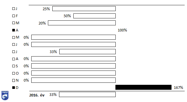 A 19. ábrán jól látható, hogy 2016-ban februárban és októberben a szélsebesség havi átlagértékei megegyeztek a sokévi átlaggal. A legnagyobb eltérés októberben mutatkozott meg, a szokásos szélsebesség 71%-át jegyeztük. Összességében elmondható, hogy a 2016. évre vonatkozóan egy kicsivel gyengébb légmozgás volt jellemző a sokéves átlaghoz képest.