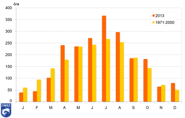 2013-ban országos átlagban 2123 napsütéses órát élvezhettünk, mely az 1971-2000-es normál 110%-ának felel meg. A legtöbb napsütés általában júliusban