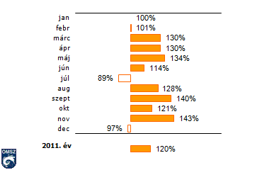 A napsütéses órák havi összegei 2011-ben az 1971-2000-esnormál százalékában