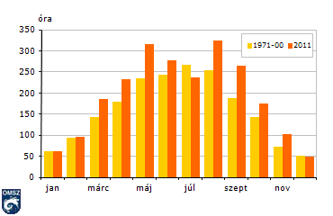A napsütéses órák havi összegei 2011-ben és 1971-2000 között