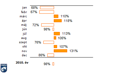 A napsütéses órák havi összegei 2010-ben az 1971-2000-esnormál százalékában