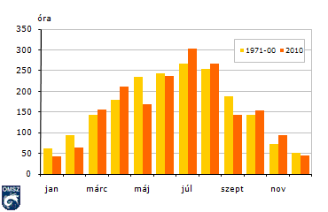 A napsütéses órák havi összegei 2010-ben és 1971-2000 között