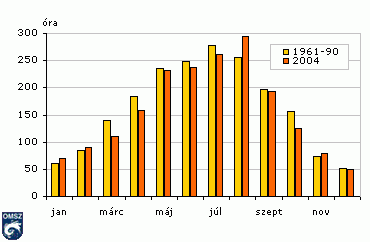 Az éghajlatot alapvetõen a földfelszínre jutó napsugárzás alakítja. Országos átlagban 1967 óra a tényleges évi napfénytartam, ami a fele sincs a csillagászatilag lehetséges értéknek. 2004-ben az átlag 97 %-ában, 1903 órán át sütött a nap. A napsütéses órák számának havi értékeit mutatja be a 23. ábra, a normál százalékában vett értékeket a 24. ábra. Január, február, augusztus és november kivételével átlag alatti mennyiségû napsütésben volt részünk az év során. A sokévi menet maximuma júliusban van, 2004-ben azonban augusztus volt a legnaposabb hónap.