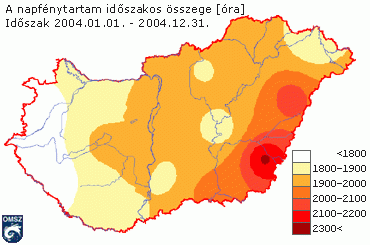 Hazánk területén a napfénytartam éves összege átlagosan 1750 és 2050 óra között alakul. A napsütéses órák éves összege 2004-ben 1660 és 2310 óra között váltakozott az ország területén, az átlagosan 1904 óra 3%-kal elmarad az 1961-90-es átlagértéktõl (24. ábra). Általában a Dél-Alföldön és Baranyában éri el a maximumát a napfénytartam, míg minimuma az Alpokalján és az ország északkeleti részén van. A napsütéses órák számának 2004. évi eloszlását mutatja az 25. ábra. A legnaposabb területek a Tiszántúl délkeleti felében voltak, míg a legalacsonyabb értékeket a nyugati határ mentén mérték.