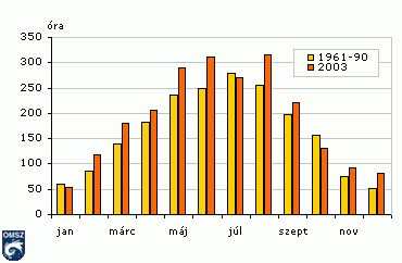 Az éghajlatot alapvetõen a földfelszínre jutó napsugárzás alakítja. Budapest-Pestszentlõricen átlagosan 1950 óra a tényleges évi napfénytartam, ami a fele sincs a csillagászatilag lehetséges értéknek. 2003-ban az átlag 116 %-ában, 2270 órán át sütött a nap. A napsütéses órák számának havi értékeit mutatja be a 18. ábra. Január, július és október kivételével átlag feletti mennyiségû napsütésben volt részünk. A sokévi menet maximuma júliusban van, 2003-ban viszont a júliusnál három naposabb hónap is volt.