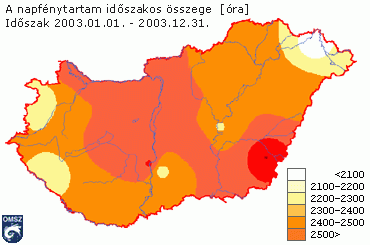 Hazánk területén a napfénytartam éves összege átlagosan 1750 és 2050 óra között változik. 2003-ban a 2050 óránál szinte mindenütt többet mértek. Általában a Dél-Alföldön és Baranyában éri el a maximumát a napfénytartam, míg minimuma az Alpokalján és az ország északkeleti részén van. A napsütéses órák számának 2003. évi eloszlását mutatja a 20. ábra. A legnaposabb területek a Körös-vidéken és a Dunántúl északkeleti felében voltak, míg a legalacsonyabb értékeket az északkeleti határ mentén mérték.