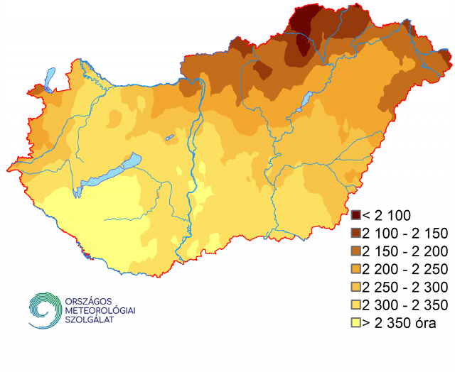 A napsütéses órák éves összege hazánk területén 2100 és 2400 óra között változott 2020-ban. A területi eloszlásában egy ÉK-DNY irányú növekedés volt megfigyelhető (25. ábra). Az Alföld déli részén, és a Dunántúlon nagy területen 2200 óra feletti értékek voltak jellemzőek, a legmagasabb értékeket (> 2350 óra) a Dél-Dunántúlon összegeztük. A legalacsonyabb értékeket (< 2100 óra) főként az északkeleti országrészben és az Északi-középhegység területén figyeltük meg.