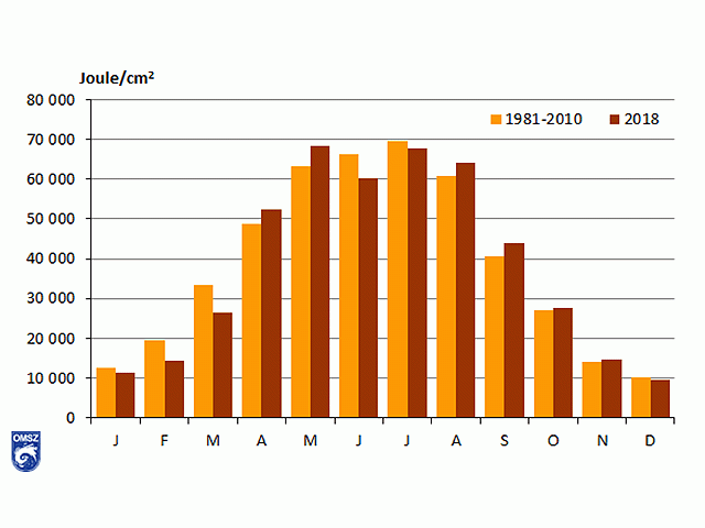 A Napból közvetlenül érkező (direkt) sugárzás és az égboltról érkező szórt (diffúz) sugárzás összegét globálsugárzásnak nevezzük. Területi eloszlása a domborzati adottságok mellett az átlagos felhőborítottsággal van kapcsolatban. A legmagasabb értékeket a derült nyári hónapokban, sokévi átlag szerint júliusban várjuk. 2018-ban Budapest Pestszentlőrinc állomáson összességében a globálsugárzás évi összege nem érte el az 1981-2010-es sokévi értéket. A legmagasabb havi összeget májusban jegyeztük (28. ábra), de tavasz végén (április, májusban), illetve augusztustól novemberig minden hónapban a sokévi átlag feletti értéket összegeztünk. A normálnál jóval alacsonyabb havi értékek főként év elején január –március között, június-július hónapokban, illetve decemberben adódtak.