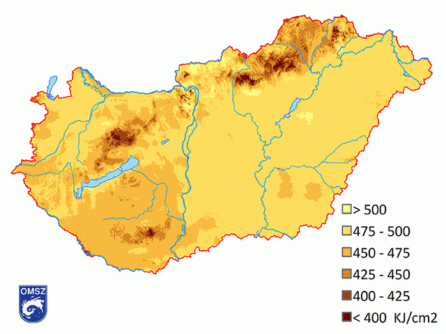 A 29. ábra a globálsugárzás területi eloszlását mutatja be. Látható, hogy az Alföldön érte el legmagasabb értékeit (475 kJ/cm2 felett). A magasabban fekvő hegyvidéki területeken és a Dél-Dunántúlon jegyeztük a legalacsonyabb évi globálsugárzás összeget (400 kJ/cm2 alatt).