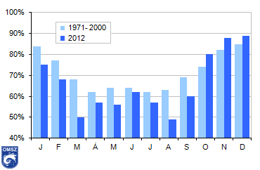 A pestszentlőrinci állomásunkon jellemző havi átlagos relatív nedvesség értékeket a 27. ábrán szemléltetjük. A relatív nedvesség értéke megmutatja, hogy a levegő nedvességtartalma hány százaléka a telítési nedvességtartalomnak. Ez az állapothatározó jellegzetes éves menetet mutat, a legalacsonyabb értékekkel nyáron. A 2012-es év menete kissé eltért az átlagostól, hiszen a legkisebb relatív nedvességi értékek márciusban és augusztusban adódtak, míg a júliusi érték például még a szeptemberi átlagot is meghaladta. Összevetve a 2012-es jellemzőket a sokéves átlagokkal (28. ábra), azt mondhatjuk, hogy az év első kilenc hónapjában a normálnál kisebb légnedvességi értékeket mértünk, míg az utolsó háromban átlag felett alakult a levegő nedvességtartalma. Összességében az éves, átlagos relatív nedvesség az 1971-2000-es sokévi átlag 93%-ának adódott.