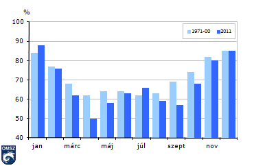 A relatív nedvesség havi átlaga Budapest-Pestszentlőrincen2011-ben és az 1971-2000-es átlagértékek (%)