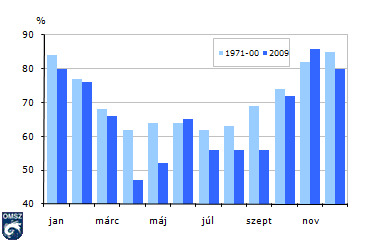 A 27. ábrán szemléltetjük a pestszentlõrinci állomásunkon jellemzõ havi átlagos relatív nedvesség értékeket. A relatív nedvesség értéke azt fejezi ki, hogy a levegő nedvességtartalma hány százaléka, a telítési nedvességtartalomnak. A 2009-es helyzet jól követte a sokéves átlag menetét, bár a maximum a vártnál egy hónappal korábban, novemberben jelentkezett. A havi csapadékösszegekkel összhangban az áprilist ebben az esetben is rendkívül alacsony érték jellemezte, csupán 76%-a volt az 1971-2000-es normálnak. Az évben általában átlag alattinak adódott a relatív nedvesség, csupán két hónapban, júniusban és novemberben volt nedvesebb a levegõ a szokásosnál (28. ábra).