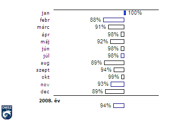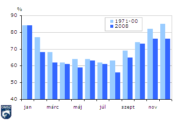 A levegõ nedvességét jellemzõ paraméternek, a relatív nedvességnek az évi menetét mutatjuk be a 27. ábrán. Az átlagos évi menetben kettõs hullám található. A minimumok áprilisban, illetve júliusban következnek általában be; a maximumok decemberben és januárban. 2008-ban 2 lokális minimum következett be az évi menetben, az elsõ májusban, a második pedig augusztusban (amely egyben az éves minimum is volt). A sokévi átlaghoz képest 1-1 hónapos eltolódás jelentkezett. Az évi maximum januárban fordult elõ. A relatív nedvesség 2008. éves értéke valamivel átlag alatt alakult (28. ábra). Minden hónapban átlag alatti nedvesség értékeket regisztráltak.