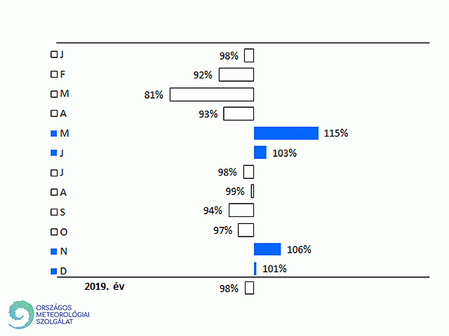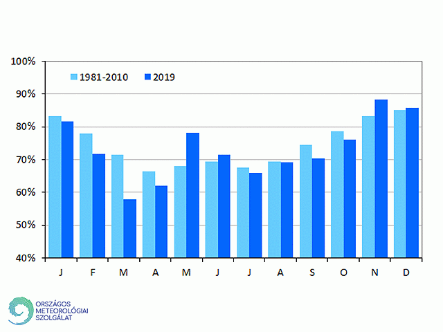 Budapest Pestszentlőrincen 2019-ben a legalacsonyabb havi átlagos relatív nedvességet a derült, csapadékmentes időjárású márciusban és áprilisban (55%) mértük, míg a legmagasabb értékek ezúttal novemberben (87%) és decemberben (85%) adódtak. A nyári hónapoktól kezdve az év végéig a relatív nedvesség havi értékei valójában az 1981-2010-es normálértékhez nagyon hasonlóan alakultak. A megszokotthoz képest (28. ábra) jelentős pozitív anomália adódott azonban májusban, amikor 21%-kal magasabb volt a levegő relatív nedvességtartama, mint a harmincéves átlag. Az 1981-2010-es normálhoz viszonyítva a legnagyobb negatív eltérést (-19%) az aszályos időjárású márciusban tapasztaltuk.