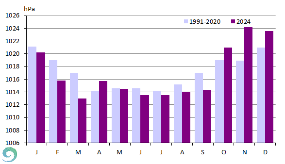 A havi átlagos légnyomás értékek alapján a nagytérségű nyomási képződmények gyakoriságára következtethetünk. 2024-ben Budapest Pestszentlőrincen a tengerszinti légnyomás havi átlaga februárban és márciusban jelentősen a normál alatt alakult, továbbá szeptemberben is elmaradt az 1991-2020-as átlagtól. Az ilyen irányú eltérés általában az alacsony nyomású légköri képződmények nagyobb gyakoriságára utal (26. ábra), ami sok esetben csapadékhullással jár, így bár az nem meglepő, hogy szeptember lett a 2024-es év legcsapadékosabb hónapja, a februári és márciusi száraz időjárás már kevésbé tipikus ilyen helyezetekben. Novemberben a megszokottnál sokkal magasabb légnyomásértékek adódtak, de októberben, decemberben és áprilisban is meghaladta a havi átlag a normált. Ezeket az anomáliákat télen gyakran hidegpárnás helyzetek, míg tavasztól őszig a tartósan fennmaradó anticiklonális helyzetek okozzák.