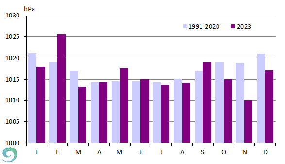 A havi átlagos légnyomás értékek alapján a nagytérségű nyomási képződmények gyakoriságára következtethetünk. 2023-ban Budapest Pestszentlőrincen a tengerszinti légnyomás havi átlaga februárban jelentősen a normál felett alakult, továbbá májusban és szeptemberben is meghaladta az 1991-2020-as átlagot. Ezeket az anomáliákat télen gyakran hidegpárnás helyzetek, míg tavasztól őszig a tartósan fennmaradó anticiklonális helyzetek okozzák. Novemberben a megszokottnál sokkal alacsonyabb légnyomásértékek adódtak, de januárban, márciusban, októberben és decemberben is elmaradt a légnyomás a normáltól. Az ilyen irányú eltérés általában az alacsony nyomású légköri képződmények nagyobb gyakoriságára utal (26. ábra), így nem meglepő, hogy ezek közül a hónapok közül kerültek ki a 2023-as év legcsapadékosabb hónapjai.