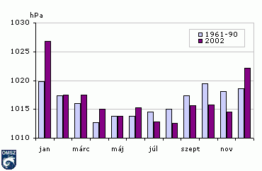 Az átlagos évi menetben kettõs hullám látható. A fõmaximum januárban van, a másodmaximum októberben. Ezeket a hónapokat jellemzi az anticiklonok gyakori elõfordulása. A minimumok áprilisban, illetve novemberben jelentkeznek, amikor nagyobb a ciklongyakoriság. A 2002. évi átlagokat reprezentáló oszlopok között az említett januári maximum erõteljes jelentkezése felfedezhetõ. Láthatjuk a július-augusztus havi csapadékos, ciklontevékenységekben bõvelkedõ idõjárás hatására jelentkezõ alacsony légnyomási átlagértéket is.