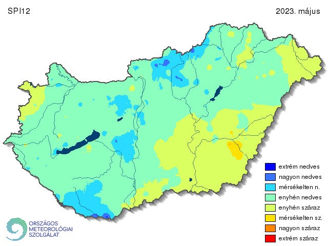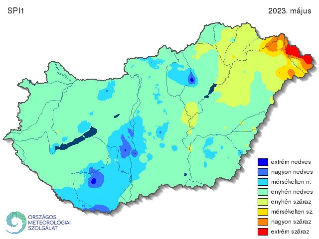 A standardizált csapadékindex (SPI) egyhavi értékei 2023 márciusában az ország nagyrészén az enyhén nedves kategóriába estek, a Kisalföldön és a déli határ mentén voltak csupán szárazabb területek. Áprilisban az ország déli és középső részein enyhén száraz vagy annál kedvezőtlenebb, míg másik részén enyhén nedves vagy annál csapadékosabb körülmények uralkodtak. Májusban döntő többségben az enyhén nedves kategória volt jellemző. Egy északkeleti-délnyugati tengely mentén előfordultak mérsékelten és nagyon nedves területek, míg Szabolcs-Szatmár-Bereg vármegyében mérsékelten és nagyon száraz területek jelentkeztek (13. ábra).