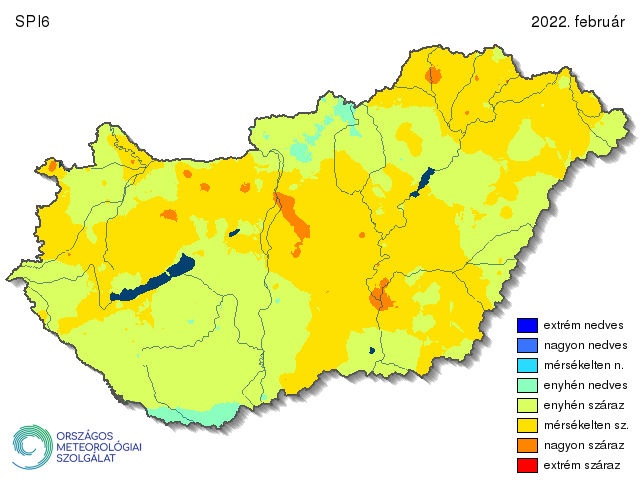 A februári SPI6 már figyelembe veszi a 2021. szeptember és 2022. február között érkező csapadékmennyiséget, így képet kaphatunk az őszi gabonáink fejlődését meghatározó vízbevételről. Az ország egésze – kivéve egy keskeny sávot Villány térségében és Nógrád megyében elszórtan – valamelyik száraz kategóriába tartozik. Nagyjából egyenlő arányban oszlik meg ezen belül az enyhén és a mérsékelten száraz területek, míg extrém száraz csak foltokban jelenik meg. Mindez köszönhető annak, hogy a télhez hasonlóan, az ősszel is csak a sokéves csapadék kb. kétharmada hullott le mindössze (14. ábra).