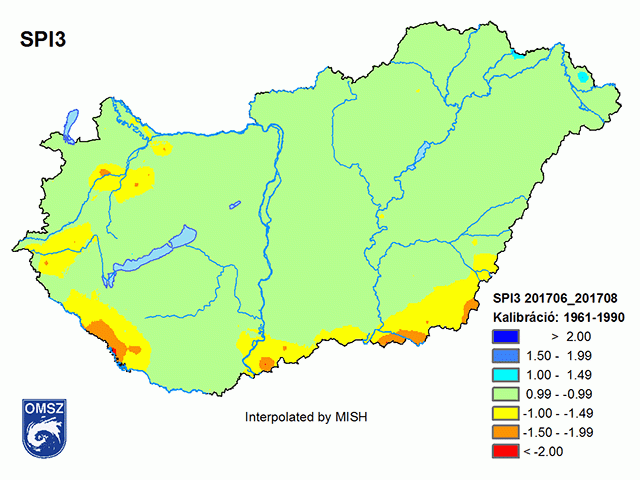 Az augusztusi SPI6 a március és augusztus között, tehát közel a teljes vegetációs periódusban lehullott csapadékmennyiséget viszonyítja az 1961-1990-es átlagokhoz. A 14. ábrán látható, hogy a Dunántúl délnyugati és az Alföld délkeleti területein már hosszabb ideje a sokévi átlag alatt maradt a lehulló csapadék mennyisége, mely valószínűleg negatív következményekkel jár az idei mezőgazdasági termelésre és az érintett régiók hidrológiai viszonyaira.