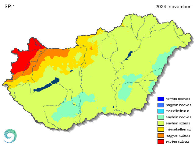 Az ősz hónapjai közül a novembert választottuk, hogy az SPI1-et közelebbről megvizsgáljuk (13. ábra). Mivel a hónap csapadékszegényebb volt a megszokottnál, így az SPI térképen is a száraz kategóriák dominálnak. A Mecsekben és az Alföld két kisebb térségében megjelenik az enyhén nedves kategória, viszont az ország legnagyobb része enyhén száraz volt novemberben. A Kisalföld és a Nyugat-Magyarországi-peremvidék már nagyon száraznak adódott, ezen belül pedig a Rábától nyugatra fekvő területek extrém szárazak.