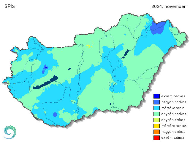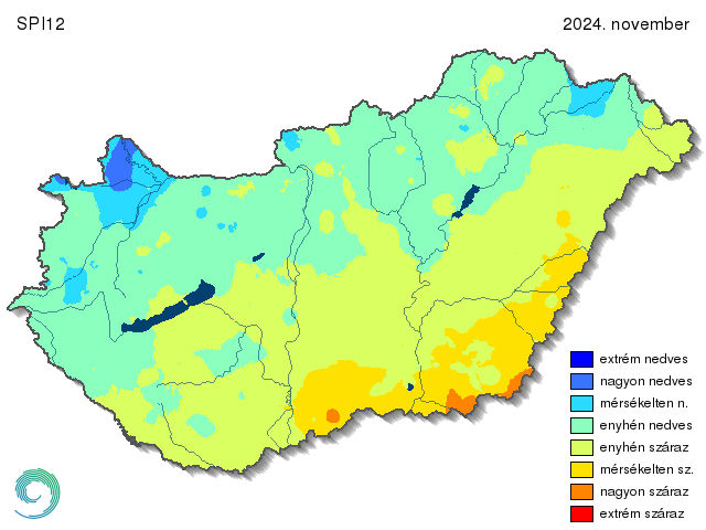 Az 1 éves időtávlatban érkező csapadékmennyiség (SPI12) hatása a 16. ábrán látható. Itt a féléves térképtől eltérően már sokkal vegyesebb képet láthatunk. Övezetesség is megjelenik a kategóriák eloszlásában: Mosonmagyaróvár térségétől indulva (ami nagyon nedvesnek számít), dél, délkelet felé haladva egyre szárazabb tájakat találunk. A Nagykanizsa-Nyíregyháza vonaltól északra találhatóak az enyhén és mérsékelten nedves, míg ettől a vonaltól délre az enyhén száraz területek. A Bácskai-síkvidék, a Berettyó-Körös-vidék és a Körös-Maros köze pedig már mérsékelten száraz volt a 2023.december - 2024.november közötti időszakban. Ezeken a tájakon helyenként már a nagyon száraz kategória is megjelenik (a román és a szerb határ közelében).
