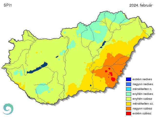 A standardizált csapadékindex (SPI) egyhavi értékei a tél folyamán 2024. februárjában érték el a meteorológiai aszály kategóriáját. Decemberben a csapadéktöbbletnek köszönhetően csak nedves területek jelentek meg az SPI1 térképen, januárban pedig enyhén nedves és enyhén száraz kategóriákra tagolódott hazánk. Mivel a február csapadékszegény volt szinte mindenhol, így az ország kb. 90 %-a valamelyik száraz kategóriába tartozott (13. ábra). Ott, ahol a hónapban kicsit több csapadékot mértünk – az Északi-középhegységben, a Mecsekben és attól nyugatra, valamint Zala vármegyében – azok a területek enyhén nedvesnek számítanak. Az Alföld legszárazabb területei – Berettyó-Körös-vidék, Körös-Maros köze –, ahol 10 mm alatt maradt a csapadékösszeg; azok már nagyon száraz és extrém száraz kategóriába kerültek.