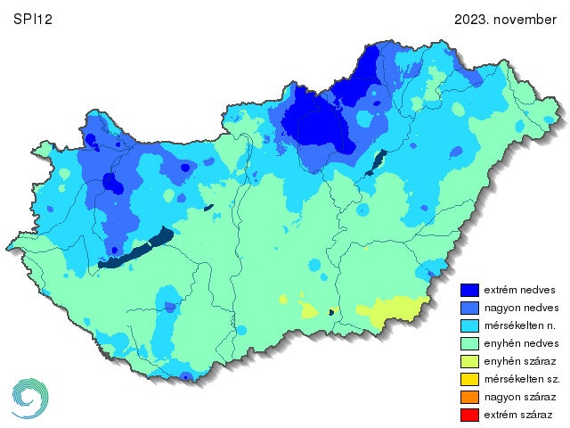 A 2023-as ősz az átlagosnál csapadékosabb volt, azonban szeptemberben a megszokottnál jóval kevesebb eső esett, míg novemberben csapadékos időjárás volt jellemző. Novemberben az egész ország valamelyik nedves kategóriába tartozott az SPI1 alapján (12. ábra). A Dunántúl legnagyobb része enyhén száraznak számított, innen kelet felé haladva egyre nedvesebb térségek voltak. A Dunától keletre fekvő tájakat már szinte csak nagyon nedves kategória uralta. Az ország északkeleti, keleti része pedig extrém nedvesnek adódott.