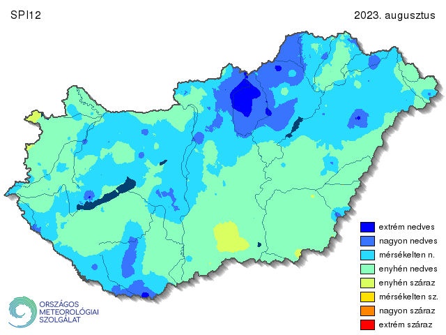 Az augusztusi SPI6 már figyelembe veszi a 2023 március és 2023 augusztus között érkező félévnyi csapadékot, így képet kaphatunk közel a teljes vegetációs periódusban lehullott csapadékmennyiségről. A helyzet annyiban hasonlít a háromhavi térképhez, hogy itt is észrevehető egy délnyugat-északkelet irányú határvonal, ami elválasztja a csapadékosabb és szárazabb területeket, de ebben az esetben ez a vonal sokkal keletebbre húzódik. Így csupán az Alföld déli részén és a keleti határ mentén azonosíthatók enyhén száraz területek. Az ország közel felén található mérsékelten vagy annál nedvesebb kategória. A Dunántúl északi részének körülbelül negyedén nagyon nedves, míg az Északi-középhegységnek mintegy felén nagyon vagy extrém nedves viszonyok voltak jellemzők. (15. ábra).