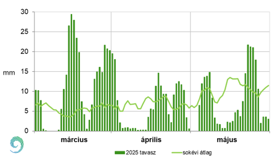 A 10. ábrán bemutatott országos átlagban vett, 5 napos csapadékösszegek a talaj vízellátottságának szempontjából lényegesek. Látható, hogy márciusban a legtöbb napon a sokéves átlagnál több csapadék hullott. Két időszak volt a hónapban, amikor jelentős mennyiség esett: 11-16. illetve 22-29. között. A hónap közepén voltak olyan napok, amikor a 25 mm-t is meghaladta az 5 napos összeg. A 16-i hidegfront miatt 17-én a lehulló csapadék halmazállapota a hűvös időben már havas eső és hó volt. 23-án pedig saras eső is előfordult hazánkban, mivel a magasban délről sivatagi por szállítódott térségünkbe. Az április szárazan indult, a hónap első felében mindössze elszórtan és kisebb mennyiségben mértünk csapadékot. 17-én egy mediterrán ciklon hidegfrontja miatt többfelé záporok, – főként a középső országrészben – zivatarok alakultak ki. Nagyrészt a zivatarok környezetében fordult elő intenzív csapadékhullás, 20 mm feletti összegek is jelentkeztek (pl. Tardoson 24,7 mm). Ezt követően 22-én és 23-án többfelé konvektív csapadékhullást figyelhettünk meg, majd 24-én egy hidegfrontnak köszönhetően ismét sokfelé záporok, zivatarok alakultak ki. A zivatargócokat lokálisan jelentős mennyiségű (30 mm feletti) csapadék és erős, viharos széllökések kísérték. Májusban a hónap elején és 21-23 között voltak jelentősebb csapadékos napok. 4-én egy hidegfront érkezett, országszerte mértünk kisebb-nagyobb mennyiségeket, a zivatarok környezetében pedig 30-50 mm is előfordult. Másnap a Győr-Szeged vonaltól délre regisztráltunk jelentősebb mértékű (10-15 mm) csapadékot. 21-én még hazánk jelentős része száraz maradt, de a konvektív csapadék helyenként nagy mennyiségű volt (pl.: Dobogókőn 38,6 mm). 22-én hidegfront érte el az országot, így egyre több helyen fordultak elő záporok, és pattantak ki zivatarok, a csapadék mennyisége északon volt több, míg délen kevesebb. 23-án – ahogy kelet felé elhagyta az országot a fent említett front – már csak a Balatontól délre és keletre fekvő tájakon esett, mennyisége csapadéknyom és 31 mm közt alakult. Május 29-én többnyire csak kisebb záporok fordultak elő, de a Hortobágyon egy hevesebb zivatarból 36 mm-t mértünk.