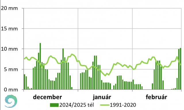 A 2024/2025-ös tél – ahogy az ezt megelőző hét tél – melegebb lett a sokéves átlagnál. Kevésbé volt meleg, mint a tavalyi, amelyik a legmelegebbnek adódott 1901 óta. Az elmúlt évszak a 24. lett az éghajlati rangsorban. Országos átlagban 1,6 °C volt a háromhavi középhőmérséklet, mely 1,2 °C-kal haladta meg az 1991-2020-as normált. A december és a január külön-külön is melegebb volt a megszokottnál. Csapadék szempontjából országosan nagy hiányok jelentkeztek: a sokéves értéknek mindössze az 57%-a érkezett. Bár térbeli egyenletlenségek voltak, időbeli kevésbé: mindhárom hónapban nagyjából a megszokott mennyiség 60%-a hullott.