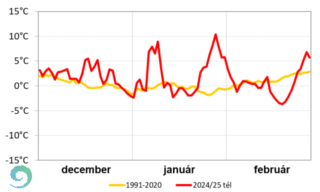 A 9. ábrán a 2023/2024-es tél napi középhőmérsékleteit és a sokéves átlag értékeit mutatjuk be. Az évszak 90 napjából 53 napon a normálnál magasabbak voltak a napi átlaghőmérsékletek. Szinte az egész december melegebbnek adódott a megszokottnál, csak 1-1 nap a hónap első és második hetében, illetve a hónap utolsó 4 napja lett hűvösebb a sokévesnél. Januárban két hosszabb és kifejezetten meleg periódus volt: január 6. és 10. között, valamint 22-től egészen február 3-ig, 13 napon át. Ekkor éltük át az évszak legmelegebb napját: január 28-án 10,4 °C volt a középhőmérséklet, mely több, mint 11 fokkal haladja meg a normált. Február 4-től viszont a következő 20 nap alatt csak 2 napon emelkedett a sokéves érték fölé a középhőmérséklet: 6-án és 14-én. Ebben a periódusban volt a tél leghidegebb napja: 19-én. Ekkor országos átlagban -3,7 °C-ot mértünk, mely 5,3 °C-kal marad el az 1991-2020-as normáltól.
