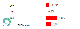 2020 nyarán a június 0,6 °C-kal, az augusztus pedig 1,8 °C volt melegebb az 1981-2010-es sokévi átlagnál (3. ábra), míg a júliusi havi középhőmérséklet szinte teljesen megegyezett azzal. Interpolált országos átlagok alapján az elmúlt 120 év idősorában csak az augusztus került a top10-be: pontosan a 10. lett. A június és a július a 120 éves rangsorban hátra szorult (I. táblázat). A 2020. évi nyár volt összességében a 16. legmelegebb nyári időszak országos átlagban a sorok 1901-es kezdete óta.