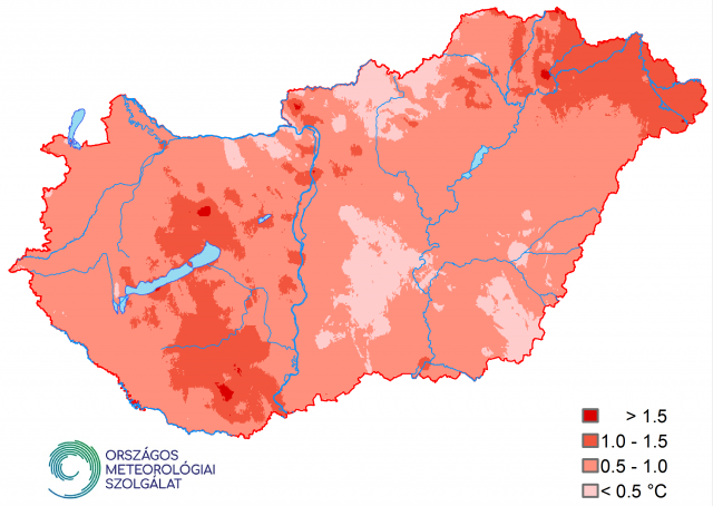 Országos átlagban az évszak középhőmérséklete 21,04 °C, amely 0,8 °C-kal meghaladja az 1981-2010-es normált. Az ország egészét pozitív hőmérsékleti anomália jellemezte (2. ábra), a legnagyobb mértékű (>1 °C) eltérést a Dunántúlon és az északkeleti országrészben figyeltük meg. Jórészt az átlag közelében maradt a hőmérséklet Bács-Kiskun, Békés és Nógrád megyékben.