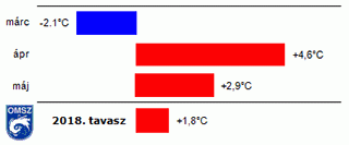 A 2018-as tavasz országos átlagban 1,8°C-kal volt melegebb az ilyenkor szokásosnál (3. ábra). A hónapokat külön-külön tekintve láthatjuk, hogy az áprilisi és a májusi középhőmérsékletek átlag felettiek voltak, az előbbi 4,6°C-kal, az utóbbi 2,9°C-kal haladta meg a normál értékét, míg a márciusi érték 2,1°C-kal elmaradt az ilyenkor megszokottól. 2018 áprilisa a legmelegebbnek, májusa pedig a harmadik legmelegebbnek adódott 1901 óta. Ez utóbbi csupán 0,1°C-kal maradt el a valaha mért legmelegebb májusi középhőmérséklettől, melyet 2003-ban mértünk.