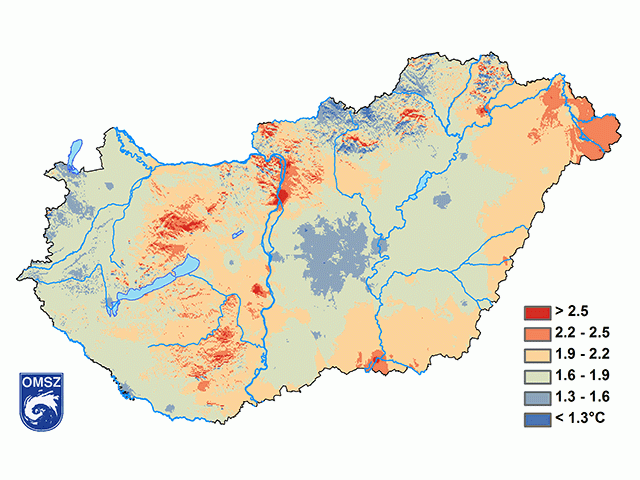 A 2. ábrán jól látható, hogy az 1981-2010-es átlagnál alacsonyabb évszakos értékek sehol sem jelentkeztek, a teljes tavaszi időszakot tekintve mindenhol melegebb volt a megszokottnál. A normált leginkább meghaladó értékek a dunántúli területeken, a Nyírség egyes részein, valamint Budapest és Szeged környékén voltak jellemzőek, itt 2,2-2,5°C feletti anomáliák is felléptek. A szokásoshoz közeli hőmérsékleti értékek az északi területeken, a Duna-Tisza köze tágabb környezetében és a nyugati határszélen jelentkeztek.