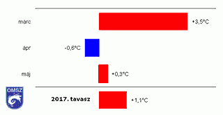 A 2017-es tavasz országos átlagban 1,1°C-kal bizonyult melegebbnek az ilyenkor szokásosnál (3. ábra). A hónapokat külön-külön tekintve láthatjuk, hogy a márciusi és a májusi középhőmérsékletek átlag feletti voltak, az előbbi 3,5°C-kal, az utóbbi 0,3°C-kal haladta meg a normál értékét, míg az áprilisi érték 0,6°C-kal elmaradt az ilyenkor megszokottól. 2017 márciusa a második legmelegebbnek adódott a mérések kezdete óta.