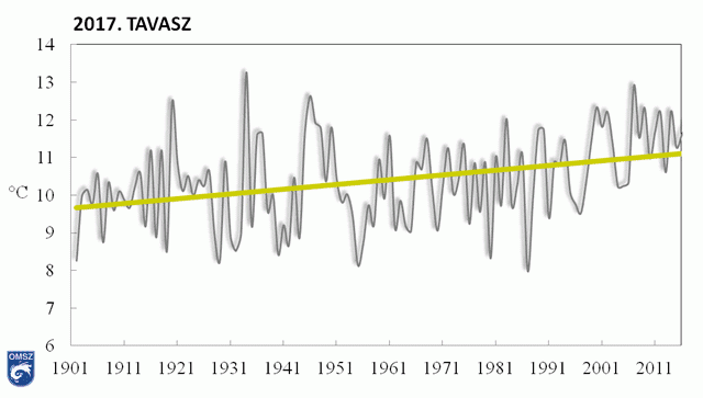 Az 1901-től kezdődő idősorban az idei tavasz a 12. legmelegebb lett (I. táblázat). Az adatokhoz illesztett lineáris trend alapján lassú emelkedést figyelhetünk meg az elmúlt 117 év tavaszi középhőmérsékleteiben (4. ábra).