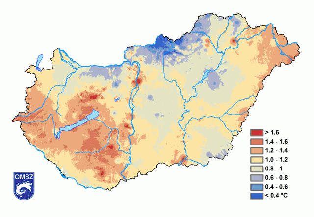 Zömmel az 1981-2010-es átlag alatt alakultak a hőmérsékleti értékek, csupán a nyugati, délnyugati országrészben és Budapest egyes részein volt ennél melegebb. A legnagyobb különbséget a Zempléni-hegységben és az Ipoly mentén figyeltük meg, ezeken a területeken mintegy 2°C-kal volt hűvösebb az átlagnál.