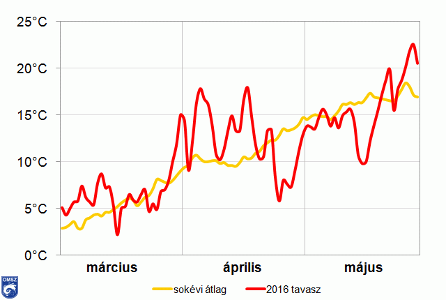 2016 tavasza a megszokottnál melegebb és szárazabb volt. Hőmérséklet szempontjából a március és az április a normálérték felett alakult. A csapadékviszonyokat tekintve az egyes hónapok változatos képet mutattak. Míg a május csapadékosabb volt a szokásosnál, addig márciusban, de leginkább áprilisban jelentős csapadékhiány mutatkozott.