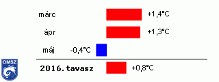 A 2016 tavasz országos átlagban 0.8 °C-kal bizonyult melegebbnek az ilyenkor szokásosnál (3. ábra). A hónapokat külön-külön tekintve láthatjuk, hogy a márciusi és az áprilisi középhőmérsékletek átlag feletti voltak, az előbbi 1.4 °C-kal, az utóbbi 1.3 °C-kal haladta meg a normál értékét, míg a májusi érték 0.4 °C-kal elmaradt az ilyenkor megszokottól.