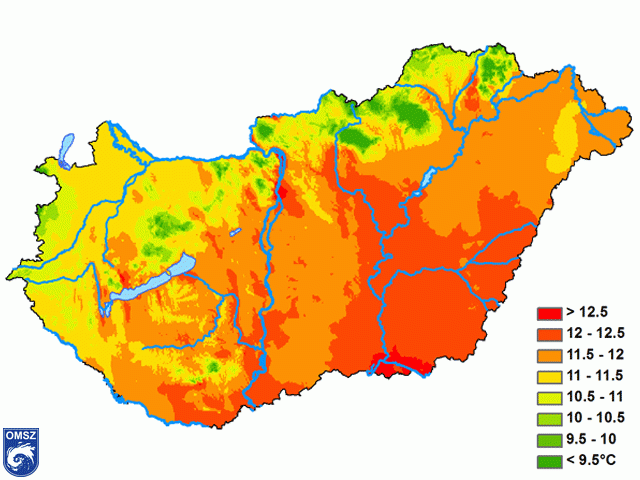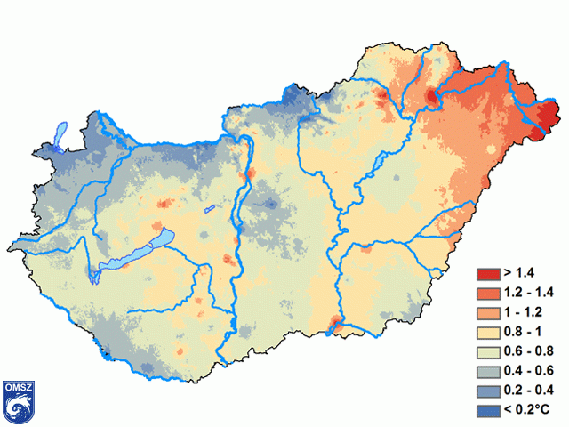 Míg a Bakony térségében jobbára 0-1 °C-kal volt melegebb a normálértéknél, addig a keleti, északkeleti területeken többnyire 1.5-2 °C pozitív anomáliát tapasztaltunk, Sárospatak és Mátraszentimre környékén még ennél is nagyobb volt a különbség. Országos átlagban a Kékestetőn volt a leghidegebb (1.2 °C), míg Budapest belterület, Budapest Lágymányos és Szeged belterület állomásunkon a legmelegebb (8.3 °C).
