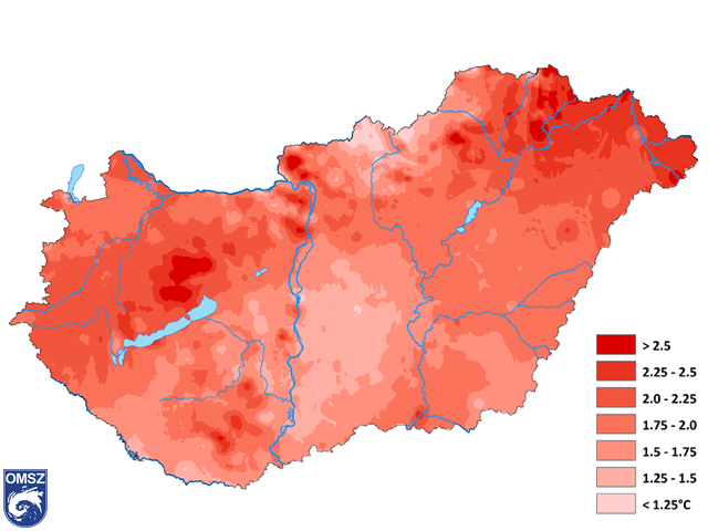 Az évszak középhőmérséklete 22.15 °C volt országos átlagban, amely csaknem 1.9 °C-kal meghaladja az 1981-2010-es normált. A legnagyobb területeken +1.5-2 °C-os anomália értékek voltak jellemzőek (2. ábra), de Zirc, Veszprém, Budapest, Mályinka, Tokaj, Sárospatak, Csenger, valamint Pécs környékén, illetve a Duna-Ipoly Nemzeti Park területén a +2.5 °C-ot is meghaladta az eltérés a megszokott értékekhez képest.