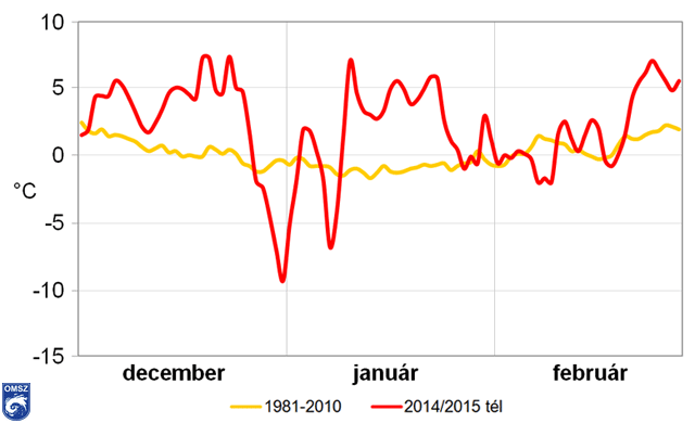 A következőkben összefoglaljuk, hogyan változott az országos átlagban vett napi középhőmérséklet a 2014/2015-ös tél során.