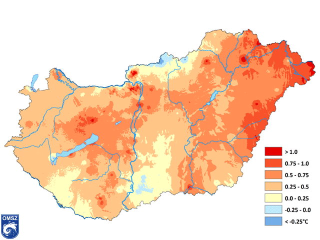 Hazánk túlnyomó részén (Nógrád megye északi részének és Baja térségének kivételével) a megszokottnál melegebb volt az idei nyár (2. ábra). A normál viszonyokhoz képest a legnagyobb pozitív anomáliát az északkeleti határszélen jegyeztük (+0.75 °C-nál nagyobb eltérés).