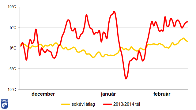 A következőkben összefoglaljuk, hogyan változott az országos átlagban vett napi középhőmérséklet a 2013/14-es tél során.