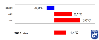Az elmúlt 113 év adatait tekintve a 2013 októberében és novemberében jegyzett havi középhőmérsékletek előkelő helyet foglalnak el az elmúlt évek őszi hónapjainak rangsorában: október a 12., november pedig a 14. legmelegebb 1901 óta. Összességében az idei ősz a 20. legmelegebb ősznek adódott.